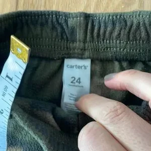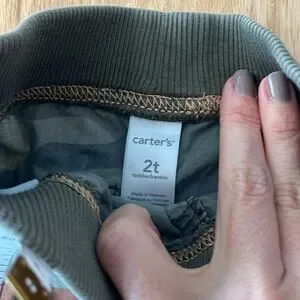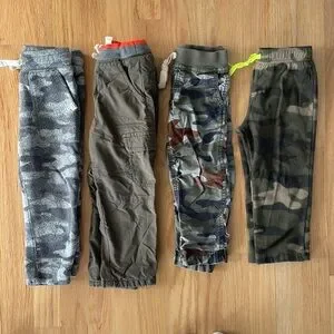 Lot of 4 pairs toddler boys camo and cargo pants. Assorted styles and brands. 3 pairs size 2T, 1 pair 24 months.