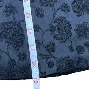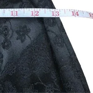 Black textured floral embossed-look weave satin fabric of 79% Acetate 14% Viscose and 7% Acrylic materials. Features side zip closure with a high rise waistline. Hem falls above the knee.
