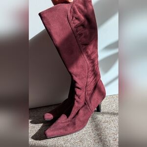 Burgundy Wine Boots 8 M Faux Suede knee high pointy toe ruching stretch heeled