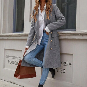 Grey Elegant Women's Double-Breasted Long Sleeve Coat