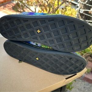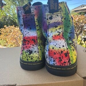 Vibrant Dr. Martens boots with a unique splatter design. Features a mix of bold colors. Perfect for making a statement.