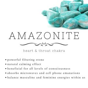 Amazonite connects the Throat Chakra with the Heart Chakra which helps encourage more loving and compassionate communication. Amazonite is also valued for its vibrant Blue Green color and is said to have many metaphysical properties including, Healing, Balance, Harmony, Peace, Luck, Calming, Communication, Creativity.