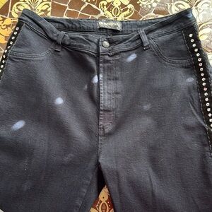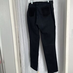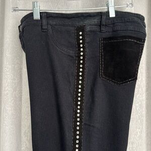 EUC STRETCH DENIM JEAN WITH SUEDE REAR POCKETS AND SIDE SUEDE & RHINESTONE SEAM EMBELLISHMENT 33” INSEAM. 34” WAIST