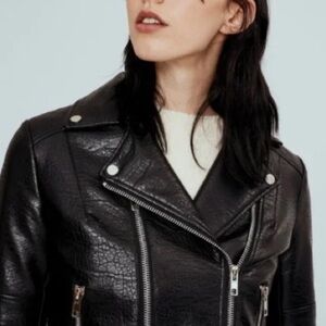 Channel your inner biker babe with this cruelty-free leather jacket. It's got everything you love about a classic leather jacket, but with none of the harm. Its cool-girl vibes all around with its front, angled zip and belted waist. Best of all, this look goes with everything from jeans and tees to floral print dresses.