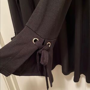 Elegant black open front cardigan by Charter Club. Women’s size large. Has a trumpet style sleeve with a decorative tie. The cardigan is 32” long, and is perfect for layering. In excellent pre-owned condition.