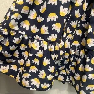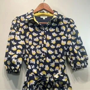This is a stylish Jade shirt dress in medium size with a floral pattern, V-neck, short sleeves, and button closure. It features ruffles, a waist tie, and pockets, made of 100% cotton fabric. The dress is knee-length, suitable for casual, workwear, and travel occasions. The design is by Jade Melody Tam, offering a classic and designer look in blue color. It is recommended to dry clean only.