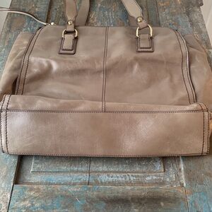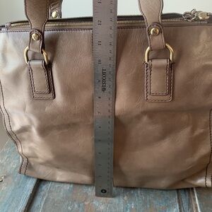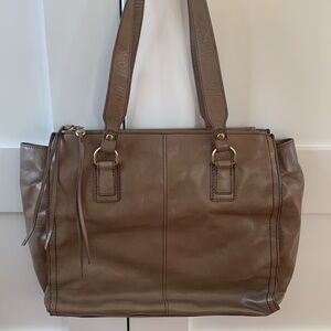 100% leather tote bag from HOBO. New without the tags. Large enough for laptop and books/ or to use for a travel bag. Brownish/ gray/ mushroom color. Strap drop is 12”