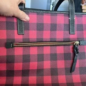 This is a red and black checked Dooney & Bourke shoulder with black trim. There is a zippered pocket on the inside and the outside of bag. There is also a cell phone holder and an additional pocket without a zipper inside. Bag is stored in container when not in use. Very little signs of wear on straps and bottom of bag.