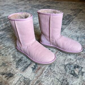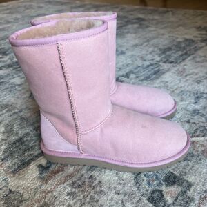 These women's take your breath away, baby or soft muted Pink Classic Short UGG boots 5825 W/ MAU pink come in a size 7. They are in excellent, like new condition! The round toe and mid-calf shaft style provide a classic look, while the soft pink color creates a feminine, casual luxury look. The boots feature lambskin or sheepskin suede outer and sheepskin shearling wool lining the inside with a wool insert, providing comfort, cushioning, and amazing warmth for your feet, while you look incredible simultaneously!