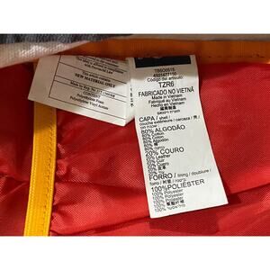 Preowned condition. As per manufacturer’s label, I wiped this with a damp cloth. Some spots remain, specifically on the lower back and in the leather bottom. See photos.