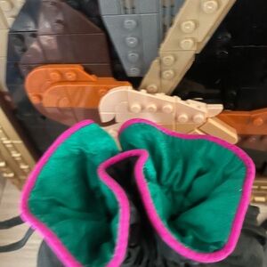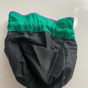 Stylish black drawstring pouch. Features a vibrant pink trim. Perfect for carrying small essentials.