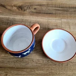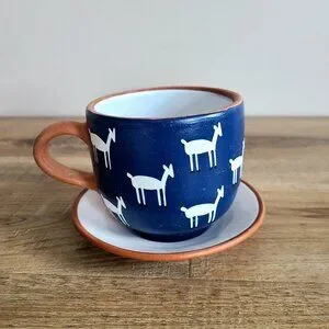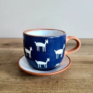 Blue cup with goat design. Super cute. Cup is 3 1/4'' tall, 3.5'' wide. Saucer is 4 7/8'' wide. Great condition.