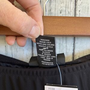 The black chiffon fabric is lightweight and flowy. The skirt is fully lined with a stretchy polyester knit fabric. The elastic waistband offers a comfortable fit.