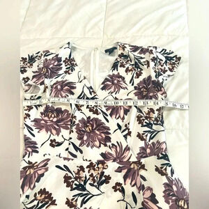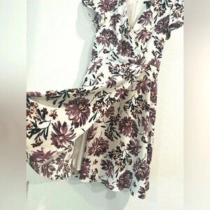 Ann Taylor Factory wrap style dress, A-line with fitted waist. Delicate flutter sleeves. White background with purple and lavender floral print. Fully lined, hidden zipper back.