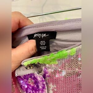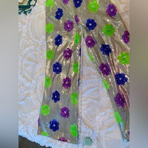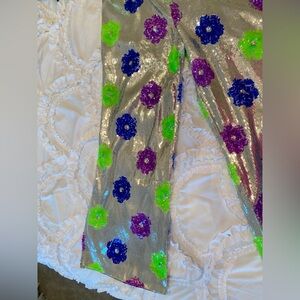 Nasty Gal Size 10 silver sequin w purple green and blue sequin flower pants.