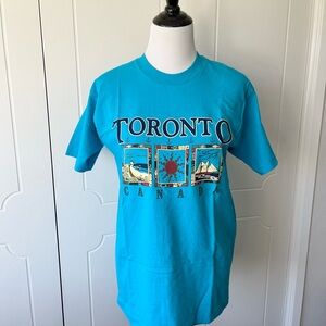 Vibrant blue Toronto t-shirt. Features graphic design with city theme. Comfortable and stylish.