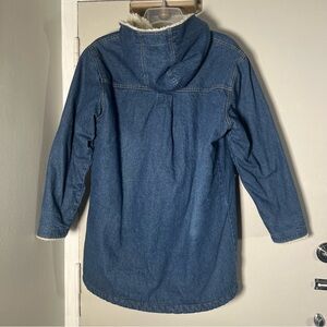 •Possibly vintage White Swan brand hooded sherpa-lined denim coat with 2 black / tuxedo cats embroidered and one blue owl