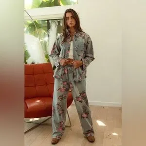 Denim floral rose elastic waist wide leg flare denim jeans pants
