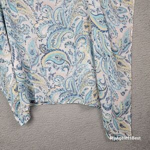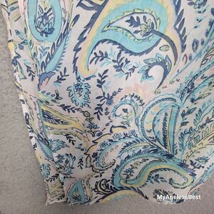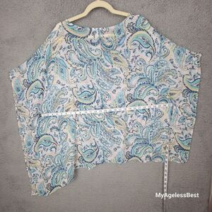Pretty paisley sheer light and airy cover up poncho in blue white pastels with a side tie accent. Tie it at the side or wear it long and loose with an asymmetrical hem. Large /X Large. Excellent, like new condition. Approximate measurements in the photos. Machine washable.