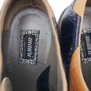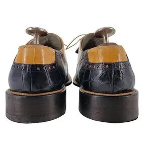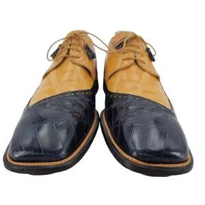 Elegant Mauri vintage alligator leather dress shoes in honey tan and navy blue. Handcrafted in Italy, these oxfords offer timeless style and sophistication, perfect for formal occasions and upscale events.