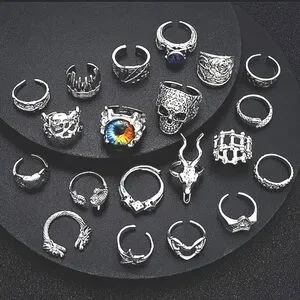 This 20 piece ring set embodies a goth, alt, and punk rock style, perfect for those who embrace a heavy metal aesthetic. The silvery design adds a touch of edgy sophistication, making it a statement accessory for fans of '90s fashion. Each ring in the set features a unique and bold design, allowing the wearer to express their individuality and style with confidence