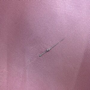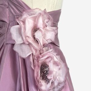 Overall this dress is in good condition. It will need to be cleaned as it has some spots from use. One small snag at bust area, one small hole at bottom of front, and raised fabric flaw at bottom side as shown in photos. Very rare princess ball gown with train and original chiffon flowers adorning back. Strapless. Zips ip the side. Full ball gown. Floor length. Dips down in back to a v on the side. Dusty peony pink. Has boning in bust area for support. Long train down one side makes it unique. Tag reads 12 but was altered so please check measurements.