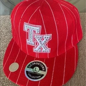 This vibrant red hat features thin white pinstripes that run vertically across the cap. It has a flat brim typical of modern baseball-style caps and showcases a prominent logo on the front.