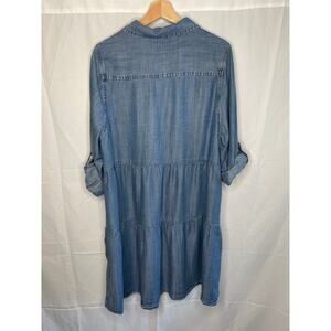 best selling tiered babydoll dress made in a lightweight denim-blue chambray Tencel™. It features a basic collar, button-up front, roll-tab sleeves, back yoke, front flap pockets, and a knee-length hem.
