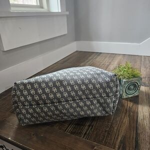 Women's Dooney & Bourke Canvas Hand Bag. Gray with Cream DB Print. Corners on Bottom A little Picked Shown. Approx 11"x14". Gorgeous High End Leather Handle. (Hasnt been Authenticated) Good Pre-Owned Condition!!