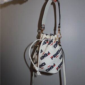 Stylish Fendi x Fila bucket bag. Features bold logo print. Drawstring closure. Gold-tone hardware accents. List it first one at the wrong price with typo. Authentic!!