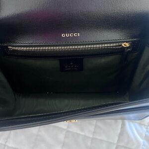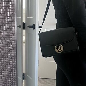 Black leather Gucci shoulder bag with hold hardware in good condition. Inside zipper pocket and another small inside pocket, as shown. Hardly worn and deciding to part with it because it is just sitting on a shelf in the closet. Small scratch shown on in photo. I believe the bag is calf leather but not entirely sure. I don’t remember. Magnetic snap closure.
