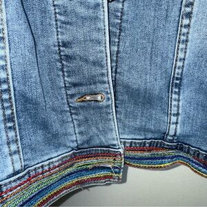 Lane Bryant women's denim jacket. Embroidered rainbow 'Love' on the back. Factory distressed. Size 28.