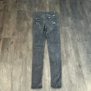 Stylish faded black/ gray denim jeans with distressed details. Perfect for casual wear. Knees are open holes