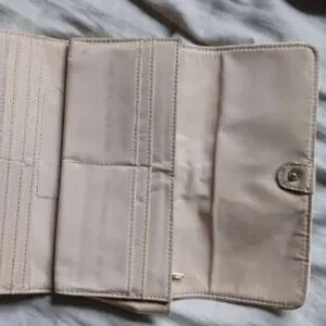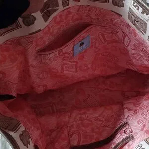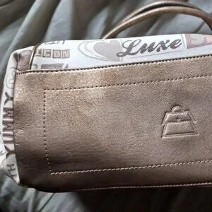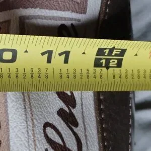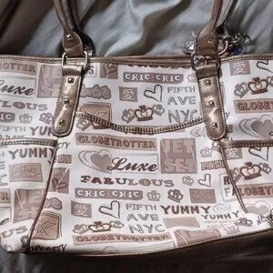Brand new adorable tote with pre-owned wallet. The tote has a few very minor flaws shown in the photos. There is a small indents on the studded strap near the hanging charms. The bottom panel has some wrinkles and a light indented line. Tote measurements - straps = 10 inches, bottom width = 11 1/2 inches, bag width = 15 3/4 inches. The wallet is still in nice condition. There are no rips or tears. No flaws on the outside. Just a tad dirty on the inside.