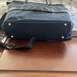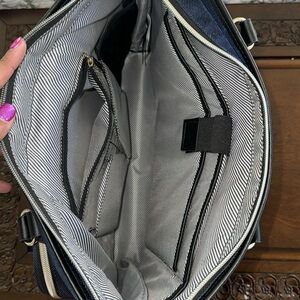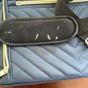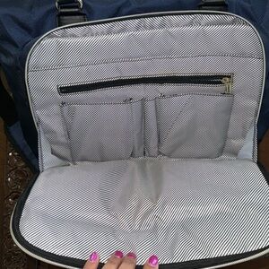 This work back from Kenneth Cole Reaction is a beautiful navy blue color with black and gold accents. Chelsea Chevron bag has a 15” laptop compartment as well as a tablet compartment. Lots of pockets to organize things. Bag has feet for stability.