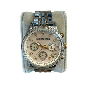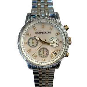 MK Michael Kors two toned watch. Mostly silver with gold details. Mother of pearl face and rhinestones at each number. Battery needs to be replaced. This watch was worn has scratches all over band, only one small scratch on the face see last photo it’s hard to photograph. This watch was well loved. Best measurement around is about 8 inches so will fit a smaller wrist. I do have 2 extra links. No original box or papers.