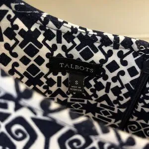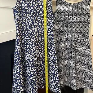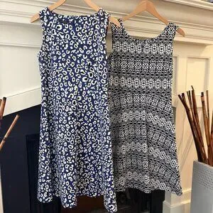 Two Talbots Dresses in gently used condition. Perfect for a beach day or when you need to throw on something quick to run errands. Always received compliments when worn. One dress is true navy and white and the other is a more royal blue, black and white. The navy/white dress as a little piling as seen in photos. They both have a ton of life left in them. See all pics for measurements.