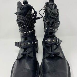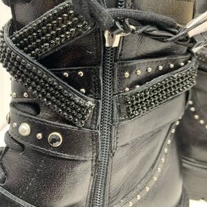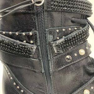 Low heeled black leather ankle boots. Leather upper with lacing, straps with metal buckles, pearls, studs, and beading. Back pull tab. Inner side zip closure.#12-192