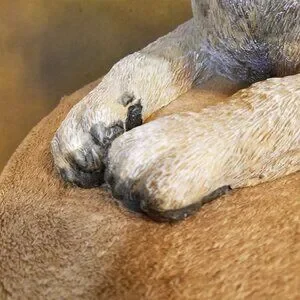 This is about 25 years old in an older heavier resin. It is almost 18 inches long. The dog has a mastiff look or a dark face lab. There are no chips or cracks.