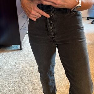 Classic Levi's Ribcage straight jeans in size 26 ankle. Worn black wash with button fly. Worn only a few times until I came to accept I cannot wear high waisted jeans. 😉 Classic cut at legs...not too wide or narrow. Model is 5'4" to gauge the length. No flaws that I can see!