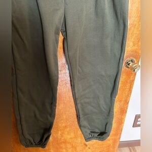 Amazon, women’s sweatpants, size large. Baggy and oversized fit, very wide legs. Olive green color. Waist is 16-17 inches, and the crotch to bottom of pant leg is about 30 inches. 95%polyester 5% spandex , brand new, never worn