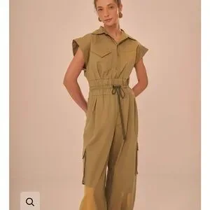 Farm Rio olive green jumpsuit with short sleeves. Features a drawstring waist and cargo pockets. Perfect for casual outings and such a versatile piece to have in your closet!
