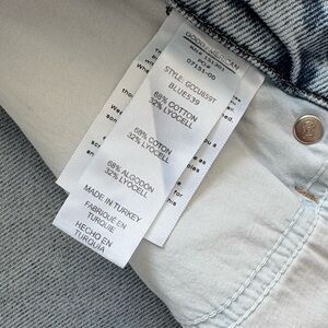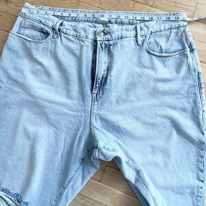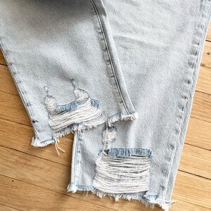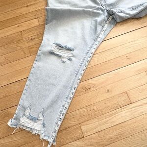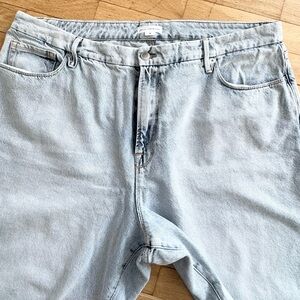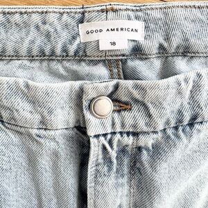Good American Good Classic Distressed Straight Leg Jeans. Raw bottom hems, distressed look, straight-leg, non-stretch denim with lived-in feel. Stock photo for reference.