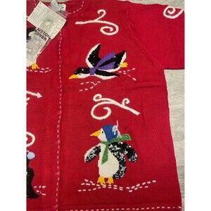 Quacker Factory Penguin Party Red Cardigan Sweater Size 2X Cozy sweater with frolicking penguin motif. Sequin accents with dimensional detail. Loose silhouette for comfort. Material is 55% ramie, 45% cotton, angora, nylon