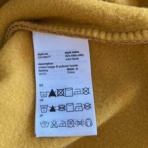 NWT WeSC unisex 90’s Mike’s utility color block fleece hoodie jacket/top, men’s large-women’s extra large, baggy fit pullover hooded sweatshirt, 100% polyester, mustard(honey)/olive green combo, retro vibes, kangaroo pocket, snap pocket on front and on sleeve, machine wash-line dry