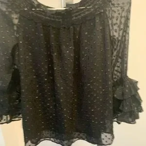 CeCe sheer, black blouse with attached tank top underneath, ruffled sleeves , can be worn off the shoulder Size L Shimmer polka dot pattern