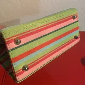 This bag is adorable! Bright green, light blue, red, and pink stripes measuring 7 1/2” wide, 3 1/2” deep and 8” high with handles down, 9 3/4 handles up. 52” strap
