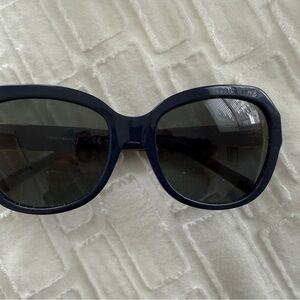 These authentic Tory Burch sunglasses have navy blue frames with khaki arms and luxurious gold trim. There are no scratches or flaws in the lenses or the frames. The case is included.