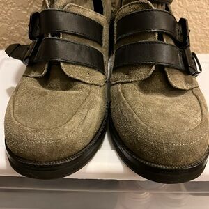 Kurt Geiger cutout slight platform 1.5 inch heel. booties. Size 37.5 euro, US size 7. Suede upper, grey/olive tone with black leather straps and black metal buckles.