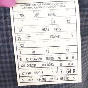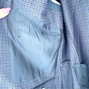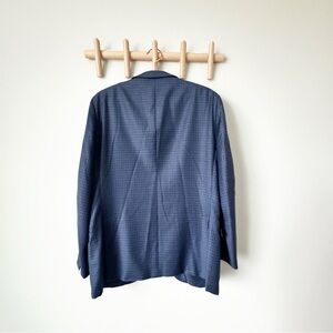 In good condition with some separation on the inside sleeve. Dark blue check print 10 pocket style blazer.